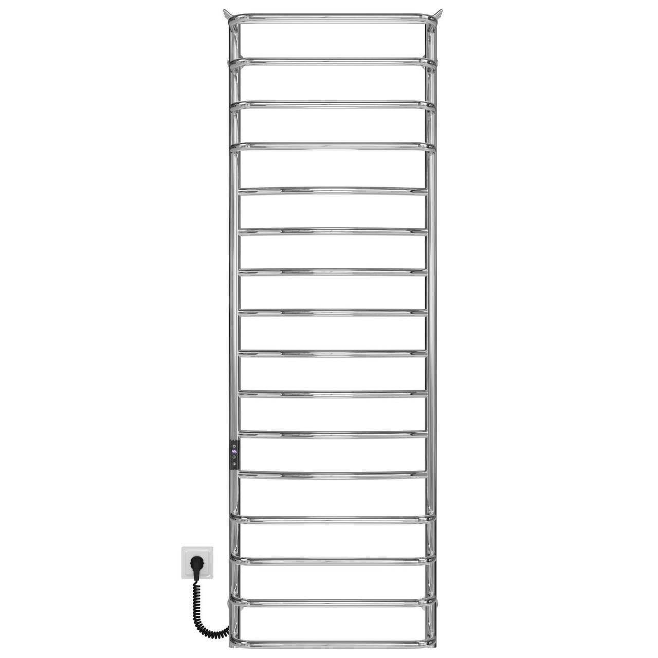 Переваги сушарки для рушників: Виготовлений із неіржавкої сталі марки AISI 201 Безпечна температура поверхні сушіння Висока ступінь ізоляції виробу Низьке споживання електроенергії Можливість встановити приховане під’єднання Електричний сушарка для рушників призначена для сушіння рушників та інших текстильних виробів у домашніх умовах. Він виготовлений із полірованої неіржавкої сталі, яка забезпечує максимально ефективне тепловіддання. Ця модель матиме чудовий вигляд в інтер’єрі сучасної ванної кімнати завдяки чітким лініям прямих перемичок, з додатковим місцем для рушників у формі полиці. У корпус сушарки для рушників вмонтований електричний нагрівальний елемент. Для зручності експлуатації на стійці сушарки для рушників встановлений термоконтролер.